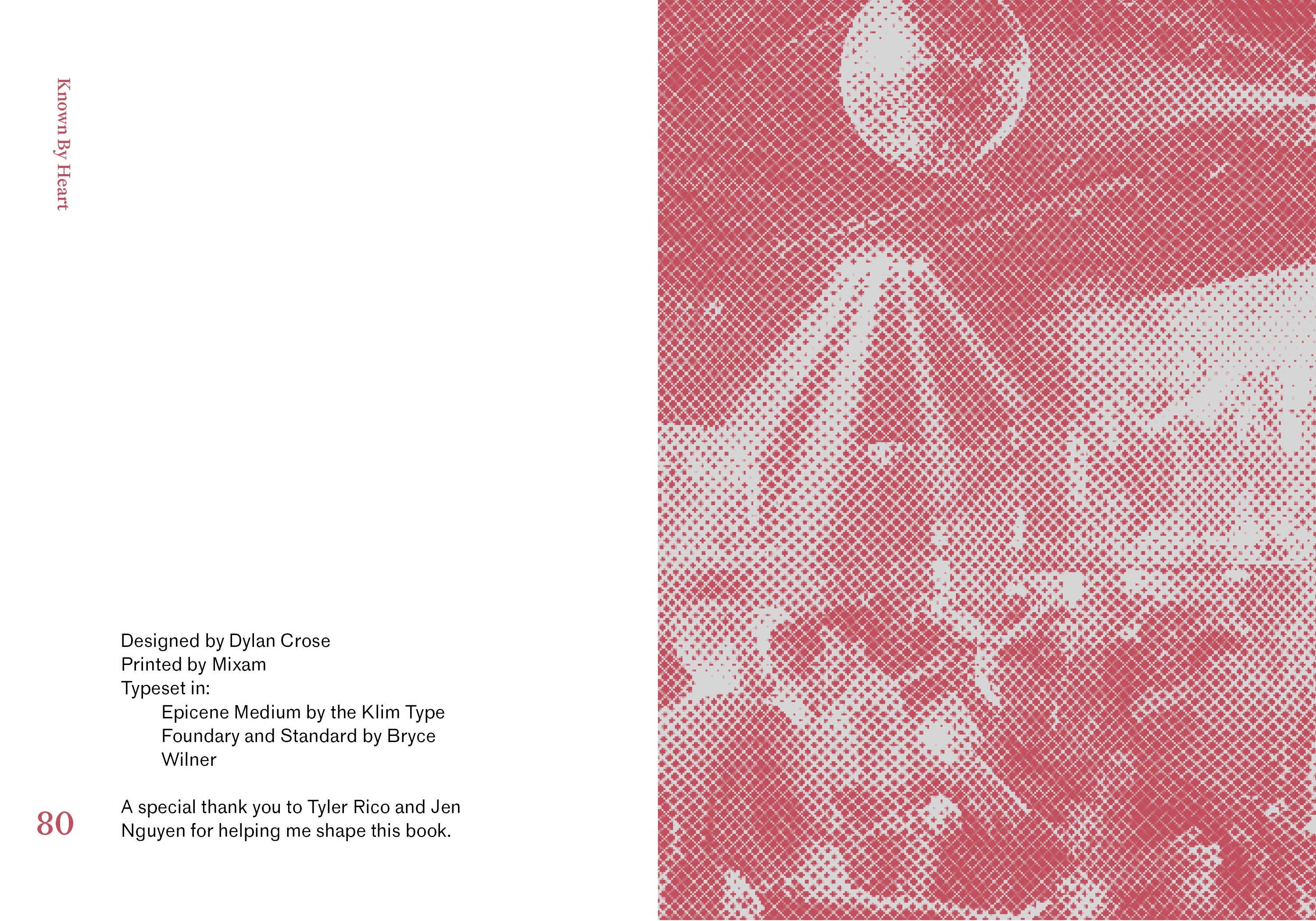 Known By Heart was a fantastic exercise in developing an art object that informs the content, Traditionally I had understood that the content had informed the book however putting the form first was an interesting thought experiment. I started with a vague idea for content that took a long time to make cohesive however I achieved it in the end. Despite the time It took I set up proper systems to help me flow my content in efficiently and I have gained a substantial amount of Indesign experience through this project.