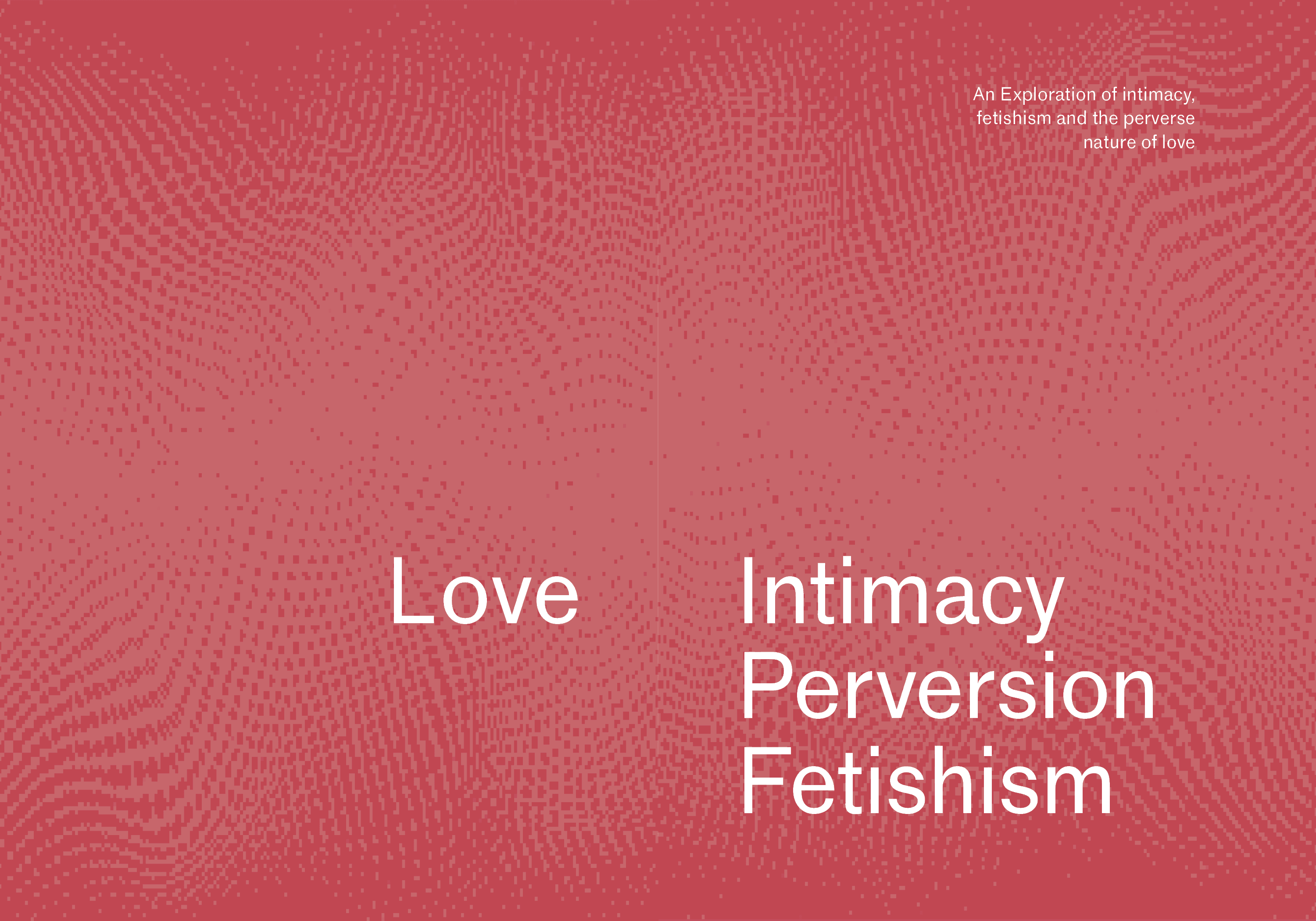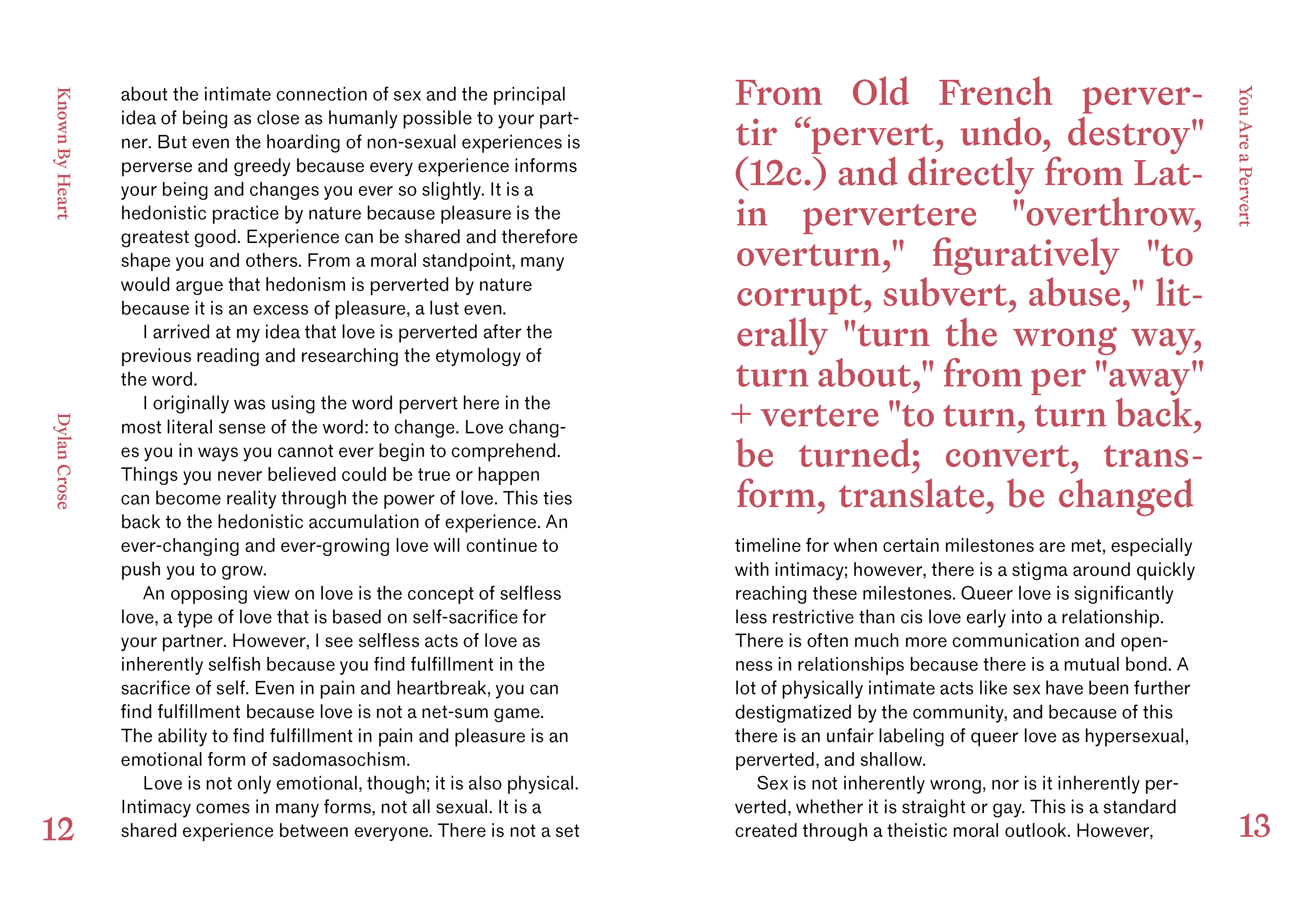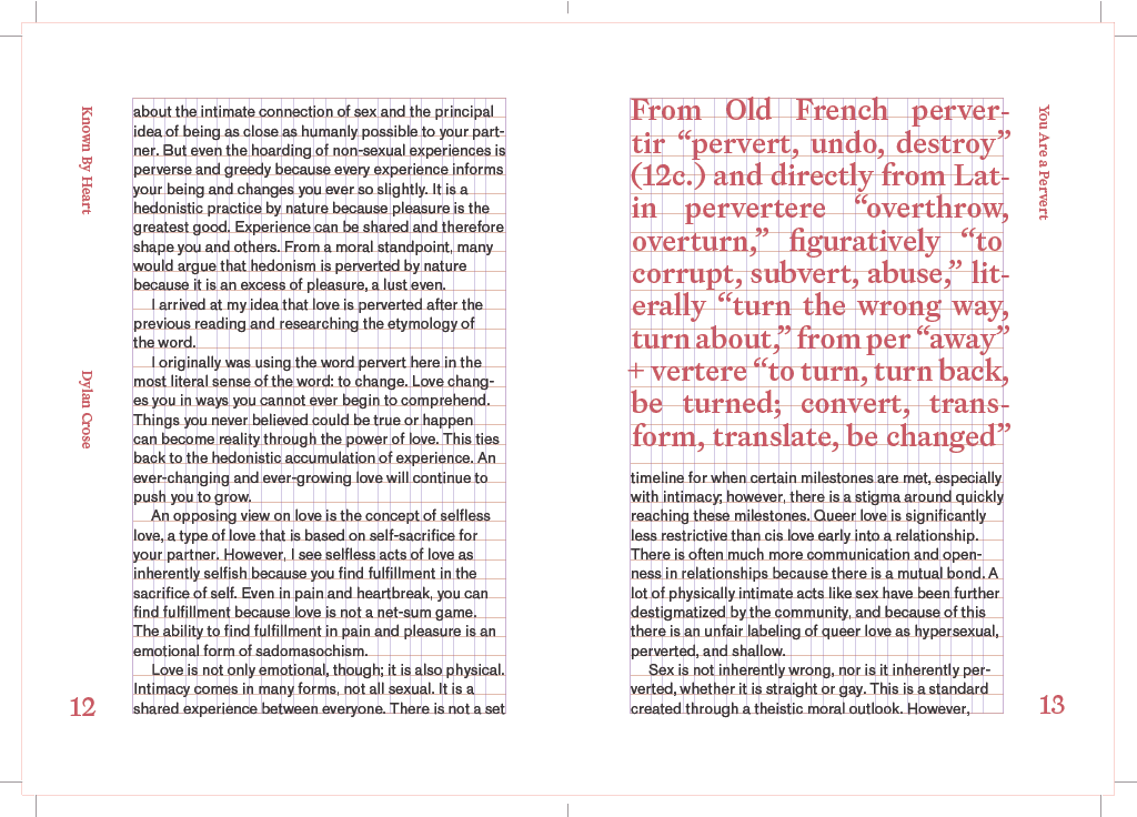 This Reader is a collection of works from many wonderful artists and writers whom I am grateful to include into my work. This Reader encompasses a phenomenon that we all experience, love; It covers many different avenues, including perversion, fetishization, queer love, cruising culture, and the loss of queer communities and how it affects the culture. I began assembling this book after reading Will it Fit by Claire Star Finch in A Queer Year of Love Letters by Nat Pyper and it sparked my interest in love and the origin of the word pervert. I came to the conclusion that love is inherently perverse and from there it evolved into the relationship between love and perversion and how it used to demonize the queer community.